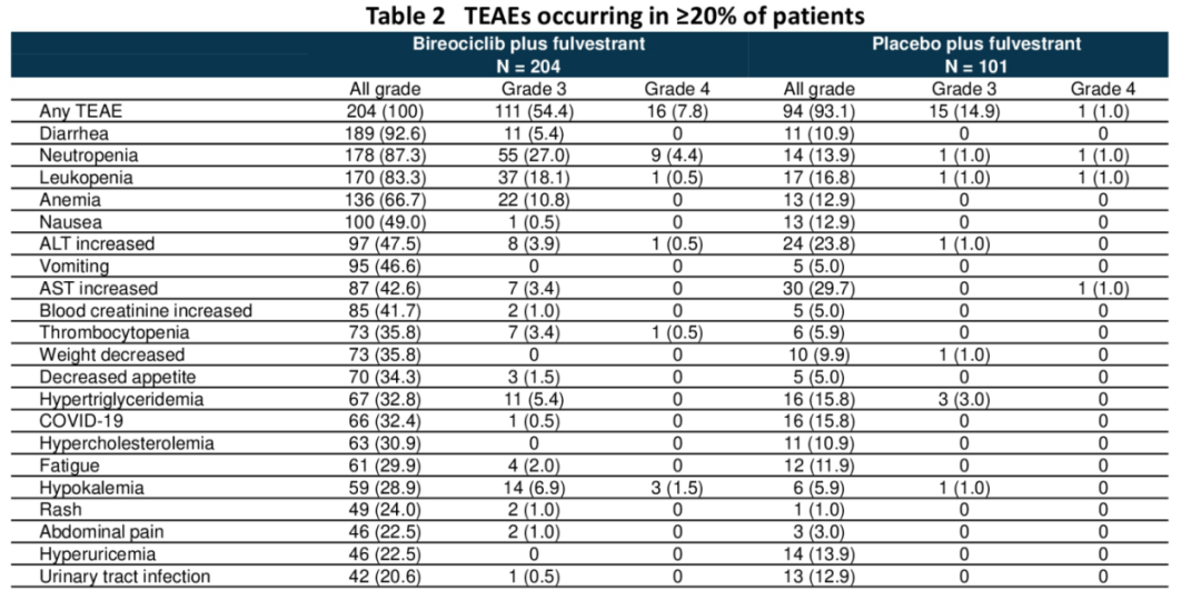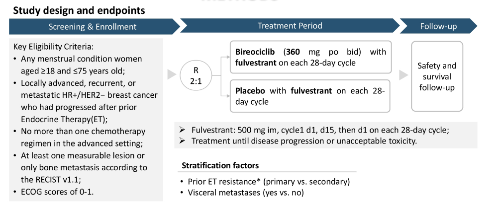 BRIGHT-2研究是一项多中心、随机、双盲、3期试验,针对先前ET期间或之后进展的HR+/HER2-ABC患者。符合条件的患者按2:1的比例随机分配,接受Bireociclib(360 mg,口服,每日两次)或安慰剂联合氟维司群(500 mg,肌内注射,第1周期的第1天、第15天,然后每个28天周期的第1天)。主要终点是基于研究者根据RECIST v1.1评估的无进展生存期(PFS)。当发生70%的PFS事件时进行中期分析。