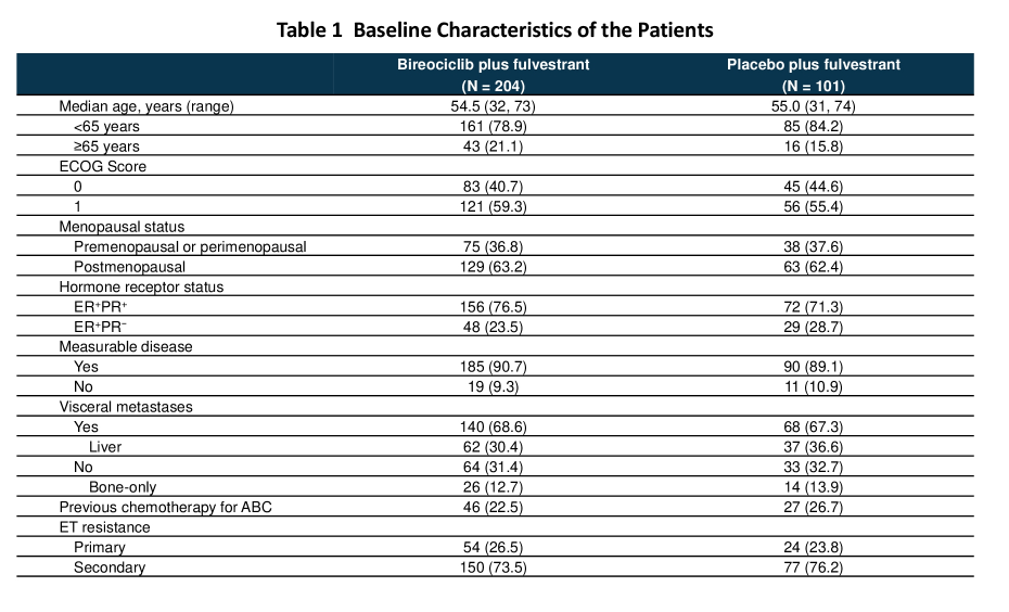 共有305名中国女性患者被随机分配接受Bireociclib联合氟维司群(BF组,n=204)或安慰剂联合氟维司群(F组,n=101)。208名(68.2%)患者有内脏转移,78名(25.6%)患者对ET有原发性耐药,73名(23.9%)患者在转移环境下接受过化疗。