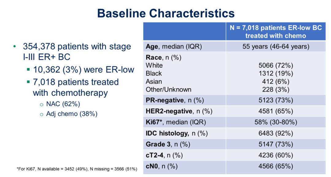 共识别出354378例Ⅰ~Ⅲ期的ER+乳腺癌患者,其中ER低表达乳腺癌患者为10362例(3%)。在ER低表达的乳腺癌患者中,73%的患者为PR阴性乳腺癌,65%的患者为HER2阴性乳腺癌。7018例患者接受了化疗(62%为新辅助治疗,38%为辅助治疗),并形成了分析队列。