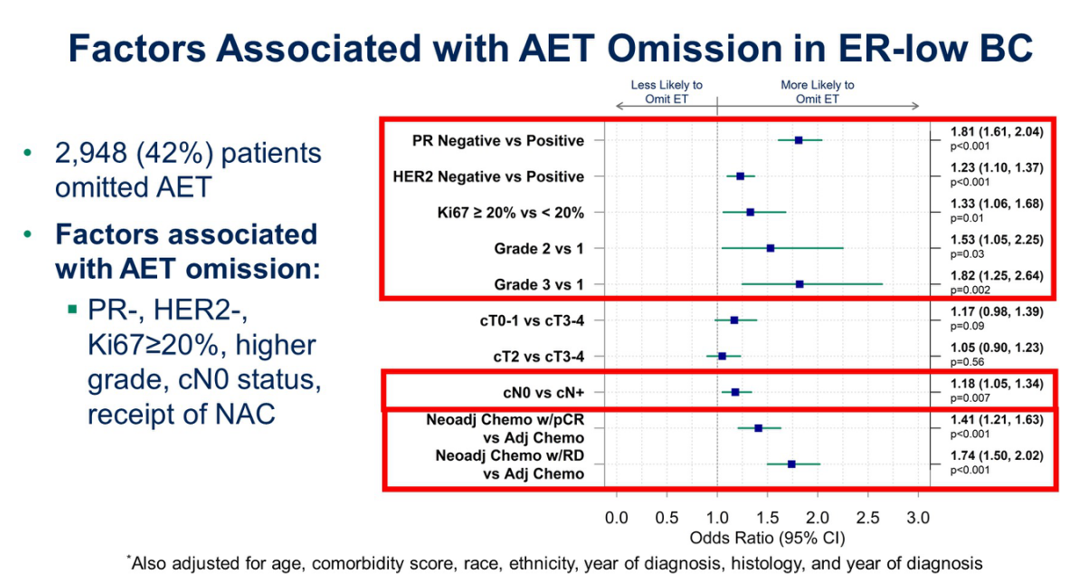 在这7018例患者中,2948例(42%)的患者省略了AET。与省略AET相关的因素:PR阴性,HER2-,Ki67≥20%,更高的肿瘤分级,cN0状态,接受新辅助治疗。