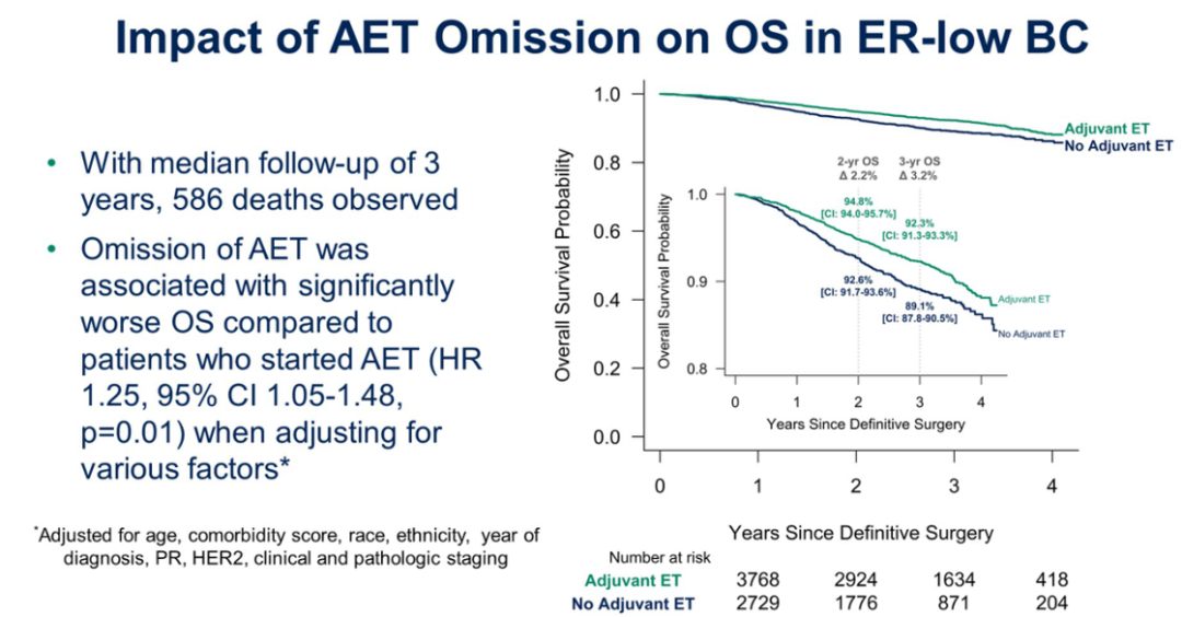ER低表达(1~10%)的早期乳腺癌患者省略辅助内分泌治疗(AET)与较差的OS相关丨ASCO 2024