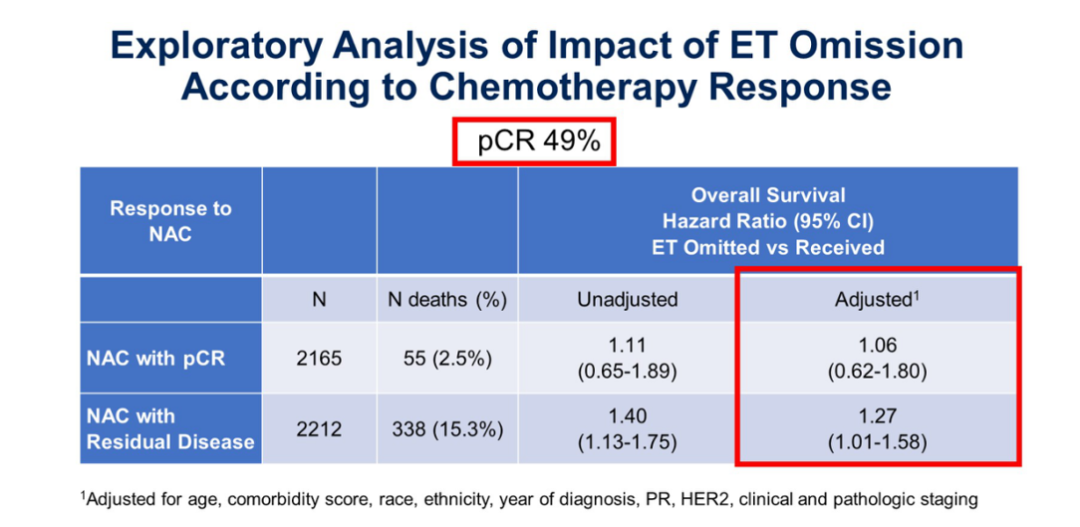 考虑到OS评估是在疫情流行的年份进行的,1/3的死亡发生在第1年随访期间,因此我们进行了一项探索性分析,以分析生存至确定手术后1年的患者的情况。在这项分析中,达到pCR和未达pCR患者省略AET对OS的校正HR分别为1.06和1.27。