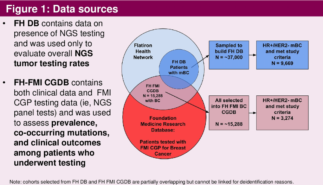 此项回顾性、观察性研究从覆盖全国的Flatiron Health电子健康记录衍生数据库(FH DB)和Flatiron Health-Foundation Medicine临床基因组数据库(FH-FMI CGDB)收集纵向的、患者级别的、电子健康记录衍生的匿名数据。此两个全国性数据库覆盖280家美国癌症诊疗机构(约800个站点,主要为社区肿瘤中心)所提取的数据。来自Flatiron Health Network的临床数据与FH-FMI CGDB中经FMI全基因组分析(CGP)检测得出的基因组数据通过确定性匹配相关联。利用FMI的NGS(FoundationOne®CDx或FoundationOne®Liquid CDx)对超过300个肿瘤相关基因进行CGP检测的结果识别基因变异。