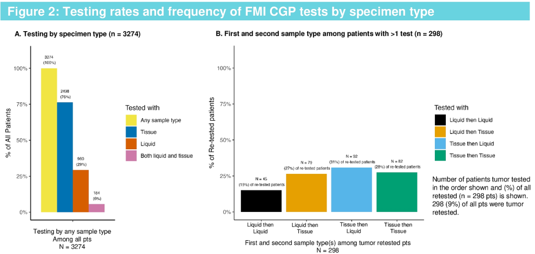 观察到298(9%)例患者在随访期间检测>1次,液体活检后使用组织样本再检测概率为27%(表2,图2)。