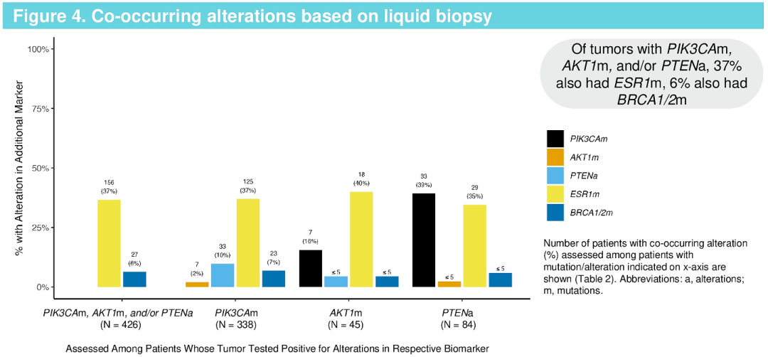 仅根据液体活检结果,426例携带≥1个PIK3CA、AKT1和/或PTEN变异的患者中,156(37%)例同时伴有ESR1变异,27(6%)例伴有BRCA1和/或BRCA2变异(BRCA1/2m)(图4)。