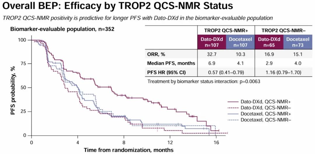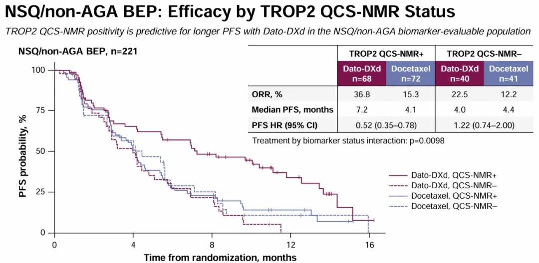 在生物标志物可评估、无可靶向治疗基因突变的非鳞NSCLC患者(n=221)中,TROP2 QCS-NMR+患者使用dato-DXd治疗的ORR为36.8%,使用多西他赛治疗的ORR为15.3%,使用dato-DXd治疗的中位PFS为7.2个月,使用多西他赛治疗的中位PFS为4.1个月(HR=0.52;95%CI:0.35-0.78)。TROP2 QCS-NMR+是这类患者通过dato-DXd(而非多西他赛)获得更长PFS的预测性标志物。在TROP2 QCS-NMR–患者中,dato-DXd治疗的ORR为22.5%,而多西他赛治疗的ORR为12.2%,中位PFS分别为4.0个月和4.4个月(HR=1.22;95%CI:0.74-2.00)。