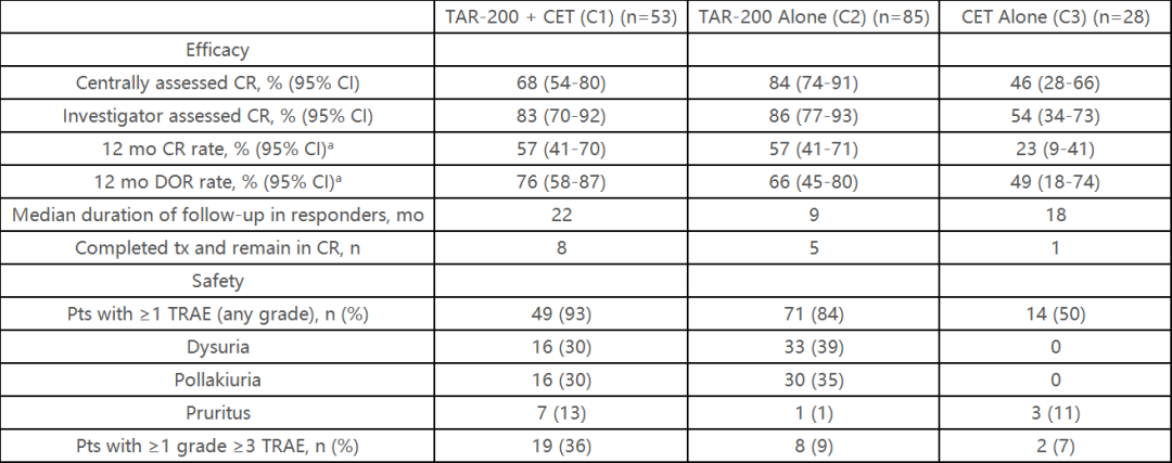 卡介苗无反应的高危NMIBC患者治疗选择有限。TAR-200是一种膀胱内靶向给药系统,可在3周内持续向膀胱输送吉西他滨。SunRISe-1研究是一项正在进行的2b期随机对照研究,旨在评估TAR-200+cetrelimab(队列C1)、TAR-200单药(队列C2)或CET单药(队列C3)治疗不适合/拒绝根治性膀胱切除术的卡介苗无反应的HR NMIBC患者的疗效和安全性。TAR-200单药治疗也在仅患有乳头状疾病患者(队列C4)进行评估。本研究分析了C1、C2和C3的结果。