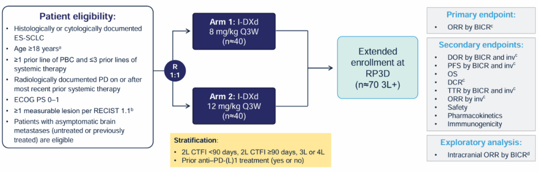 这项II期研究纳入复发性转移性ES-SCLC患者,这些患者曾接受过至少一线铂类化疗和最多三线全身治疗。受试者年龄≥18岁,东部肿瘤协作组(ECOG)体能状态(PS)评分为0-1,可能患有无症状脑转移,无论是未治疗还是先前治疗过。患者被随机分配每3周接受I-DXd 8mg/kg或12mg/kg。“这确实是一种选优设计,有助于确定III期试验的后续剂量,”报告人、纪念斯隆凯特琳癌症中心Charles M.Rudin说。在剂量优化阶段,46名患者被分配到I-DXd 8mg/kg组,而42名患者接受I-DXd 12mg/kg治疗。低剂量组有更高比例患者是女性,且PS评分为0。