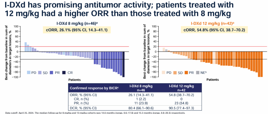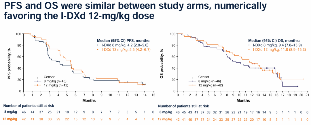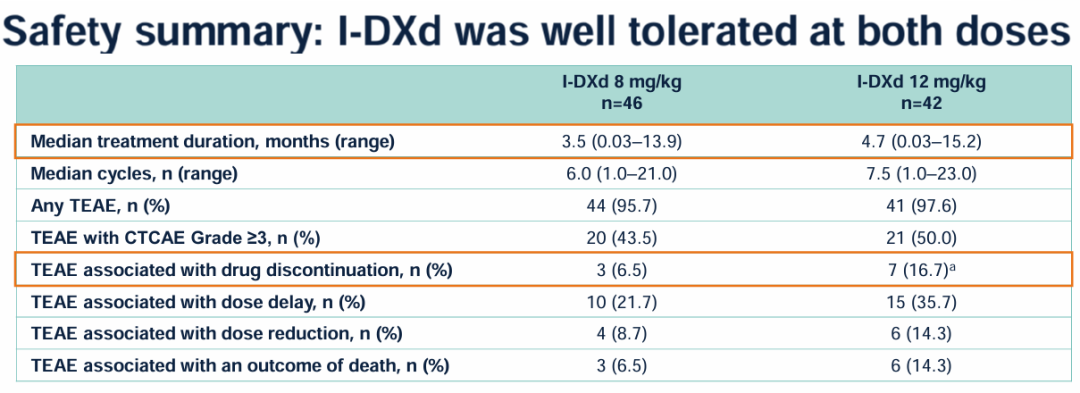 安全性:在43.5%接受8mg/kg和50.0%接受12mg/kg的患者中观察到≥3级治疗期间出现的不良事件(TEAE),其中6.5%和16.7%的TEAE与停药有关。最常见的治疗相关TEAE是恶心、食欲下降和贫血,这些TEAE在接受12mg/kg剂量的患者中比接受8mg/kg剂量的患者中更常见。间质性肺病/肺炎的发生率在低剂量组和高剂量组分别为8.7%和11.9%,低剂量组有一例死亡与此不良事件有关。