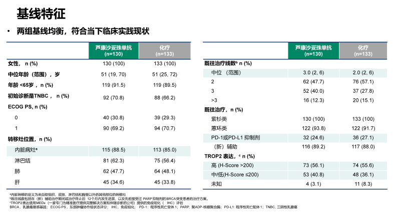 OptiTROP-Breast01研究共入组了263例局部复发转移性TNBC患者,①针对不可切除,局部晚期或转移性疾病既往接受≥2种化疗方案后复发或难治性,②既往在(新)辅助治疗期间或终止治疗12个月内发生进展的可以算作一种治疗方案,③在任何阶段接受过紫杉类药物治疗。随机分配至芦康沙妥珠单抗组(130例患者)和医生选择的化疗方案组(艾立布林/长春瑞滨/卡培他滨/吉西他滨,133例患者)。主要研究终点是PFS(BICR),次要终点包括:OS、PFS(研究者评估)、ORR、DOR和安全性。分层因素包括:既往治疗线数(2–3 vs>3),存在肝转移(是vs否)(如图2所示)。