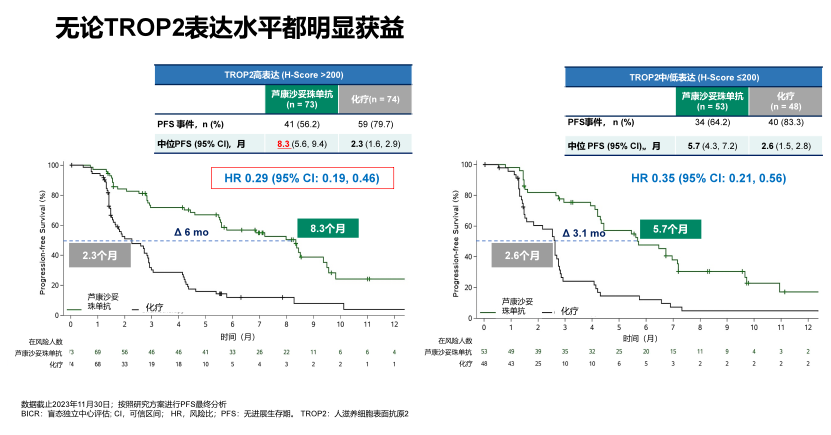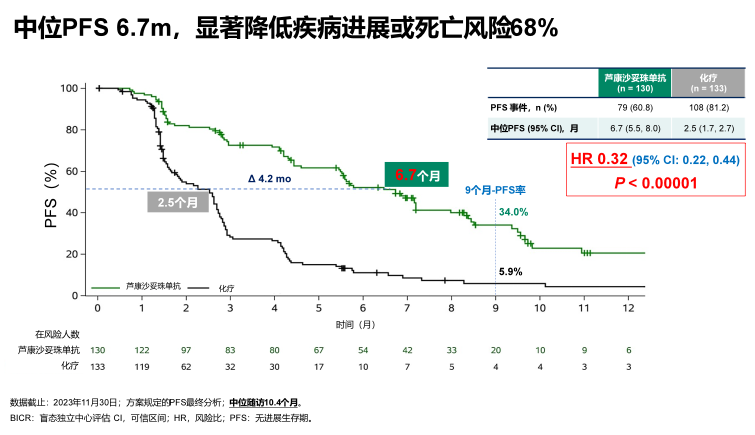 数据截至2023年11月30日(中位随访时间10.4个月),该研究已达到PFS主要终点。根据BICR评估的结果,芦康沙妥珠单抗和化疗组患者的mPFS分别为6.7个月(95%CI:5.5-8.0)和2.5个月(95%CI:1.7-2.7)。相比化疗,芦康沙妥珠单抗显著降低疾病进展或死亡的风险68%(HR=0.32,95%CI:0.22-0.44,P<0.00001)。