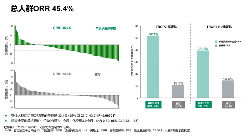 客观缓解率(ORR)芦康沙妥珠单抗组为45.4%,化疗组为12.0%,提升约4倍。肿瘤自基线变化的瀑布图显示大部分患者的肿瘤都获得一定程度的退缩,并且肿瘤缓解的持续时间较为持久(DOR为7.1个月)