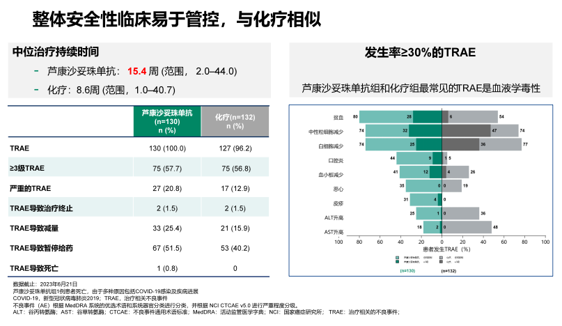数据截止2023年6月21日,安全性分析结果显示芦康沙妥珠单抗整体安全性良好,与化疗相似。中位治疗持续15.4周,患者因TRAE导致治疗终止的比例为1.5%,因TRAE导致减量的比例是25.4%,导致减量的最常见TRAE是贫血(13.8%)口腔黏膜炎(5.4%)。最常见的的TRAE是血液学不良反应,贫血80%(≥3级28.0%)、中性粒细胞计数下降74%(≥3级32.0%)和白细胞计数下降74%(≥3级25.0%)。口腔粘膜炎发生率44%(≥3级9%)。