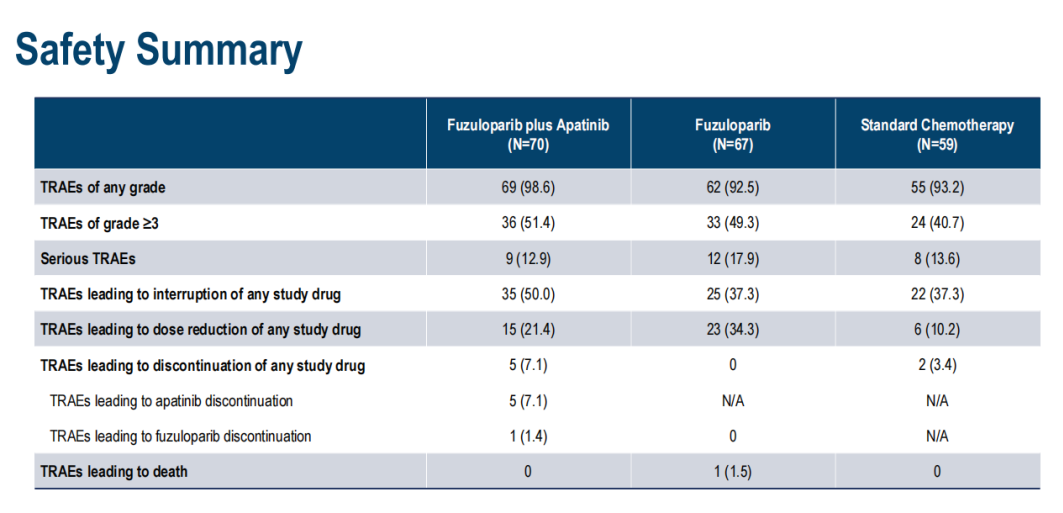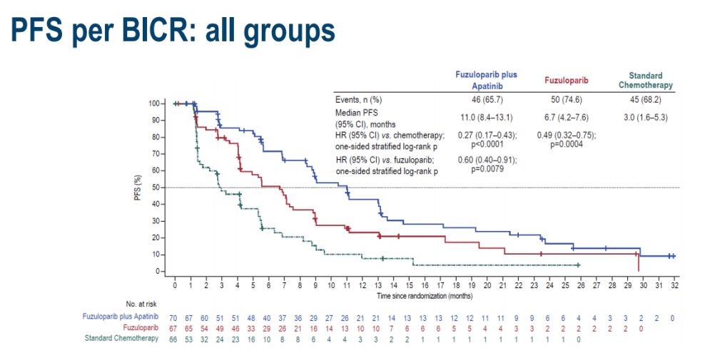 经过多年的努力,该研究结果令人非常振奋。F+A组的mPFS为11个月,ORR为67.3%;F组的mPFS为6.7个月,ORR为43.6%,化疗组的mPFS为3.0个月,ORR为23.3%。