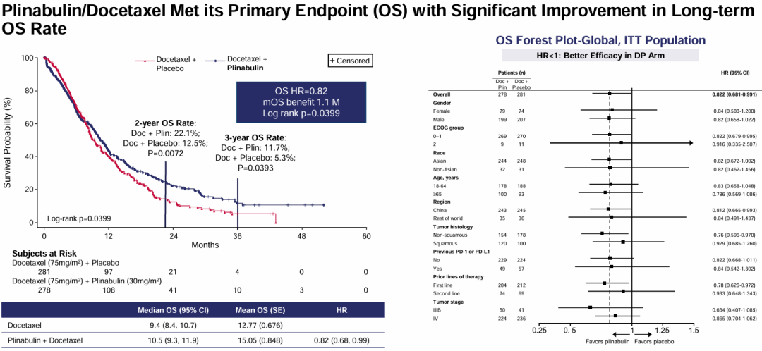 韩宝惠教授:在2024年美国圣地亚哥举办的第五十届世界肺癌大会(WCLC 2024)上,我们团队有两项研究成果入选。第一项研究聚焦于驱动基因阳性肺癌的二线治疗,这是一项自2015年起便启动的国际多中心临床研究(DUBLIN-3),横跨中国、美国及日本,共纳入了559名患者参与随机对照分组。研究中,对照组采用标准二线治疗方案多西他赛,而研究组则在此基础上联合应用普那布林。历经八年多不懈努力,我们在大会上揭晓了振奋人心的成果:研究达到了预期的阳性终点,总生存期(OS)的HR值为0.82,与对照组相比展现出显著的统计学差异(P=0.0399)。尤为值得一提的是,两年及三年OS生存率分别达到对照组的2倍左右,这一突破性发现赢得了国际同行的高度赞誉,并同步发表于《柳叶刀-呼吸医学》期刊。