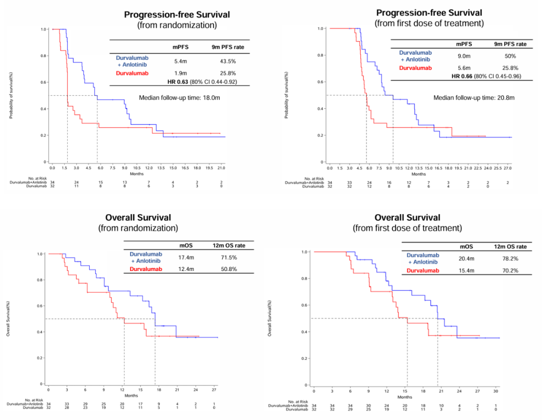 第二项研究(DURABLE)则聚焦于小细胞肺癌(SCLC)患者一线治疗后的维持治疗策略,我们创新性地设计了度伐利尤单抗联合EC化疗方案。患者在接受4个疗程化疗并进行疗效评估后,未出现疾病进展(PD)的患者被随机分为两组:对照组仅接受单药度伐利尤单抗维持治疗,而研究组则采用度伐利尤单抗联合安罗替尼的双药维持方案。研究的主要终点为从随机分组开始的PFS。研究结果显示,双药维持方案将PFS从单药的1.9个月显著延长至5.4个月(HR 0.63)。如果从一线治疗开始计算,联合维持治疗更将中位PFS从5.6个月延长至9个月(HR 0.66)。此外,初步的OS数据也显示出从单药维持组的12.4个月延长至双药维持组的17.4个月,如果从一线治疗开始计算,中位OS则由15.4个月延长至20.4个月。这两项研究成果不仅为临床治疗策略提供了新的选择与参考,更为解决临床实际需求增加了新的循证医学证据。
