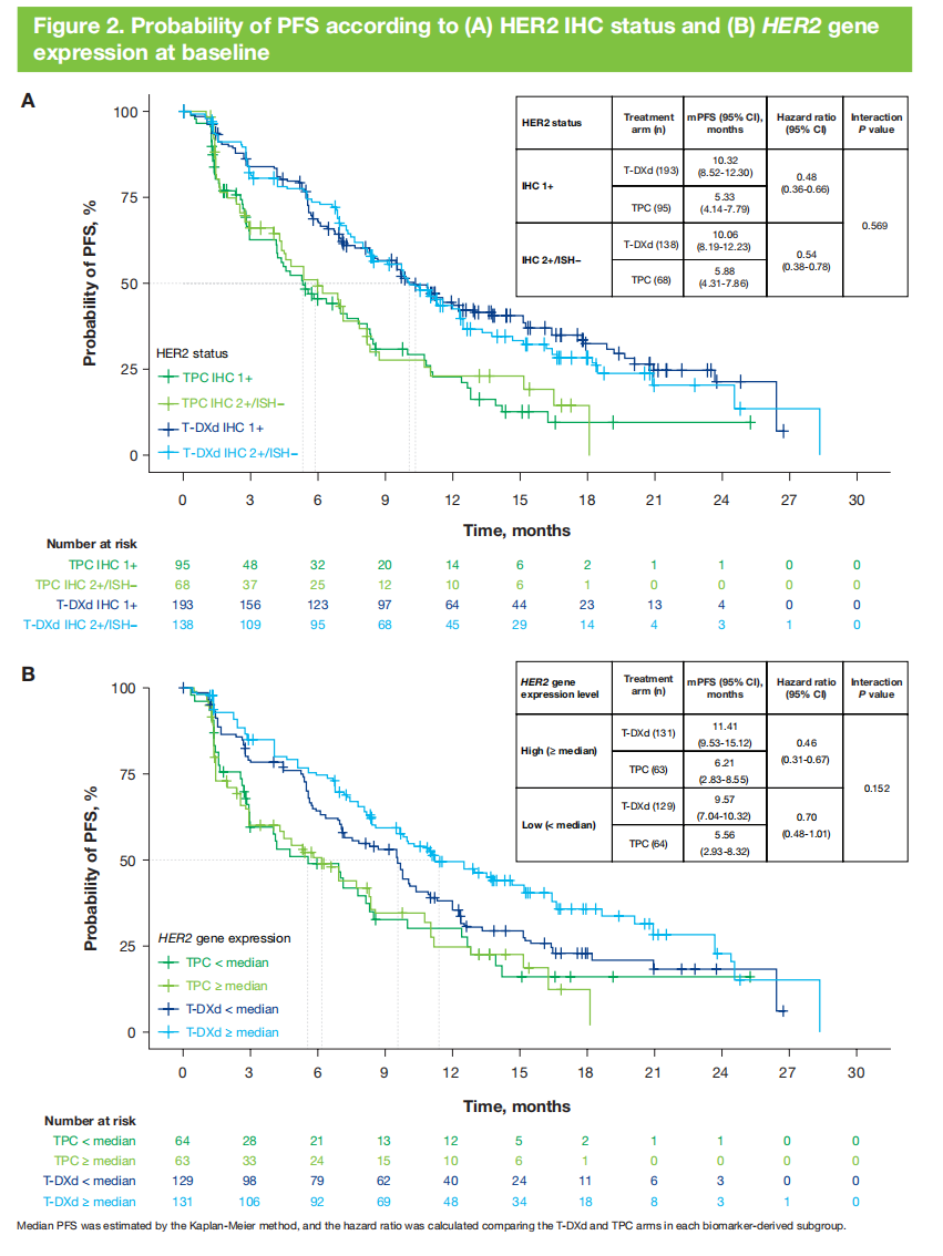 无论HER2免疫组化(IHC)状态、HER2基因表达水平或HER2突变状态如何,均观察到T-DXd组相较于TPC组的临床获益,且基于这些HER2生物标志物的分析未显示出统计学上的显著交互作用(图1、图2)。