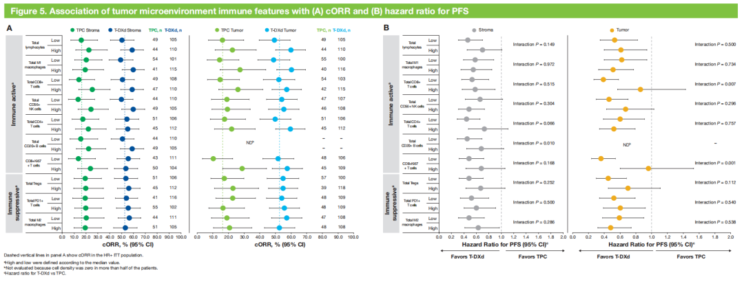 通过多色IHC分析测量的大多数免疫特征,我们观察到了T-DXd组相较于TPC组的临床获益(图5、图6)。
