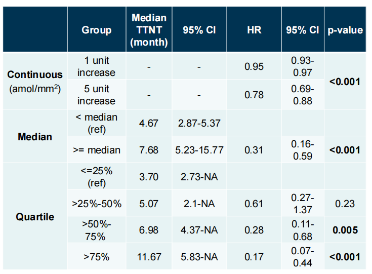 在最接近T-DXd治疗前收集的样本中,我们评估了HS-HER2与至下一次治疗时间(TTNT)和总生存期(OS)之间的关联,评估方式包括连续变量分析和按HS-HER2四分位数分析。