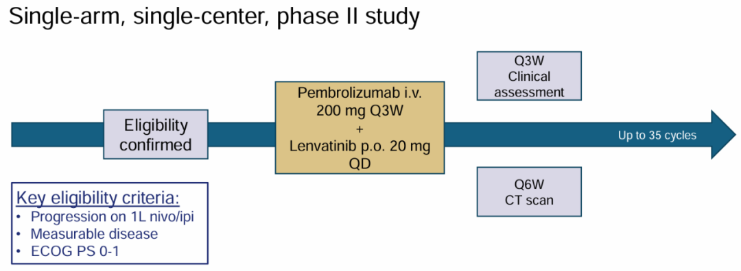 作为首批探索胸膜间皮瘤患者在免疫治疗进展后免疫再挑战的研究之一,PEMMELA队列2旨在评估一线纳武利尤单抗+伊匹木单抗治疗进展后,应用帕博利珠单抗+仑伐替尼方案的疗效和安全性。