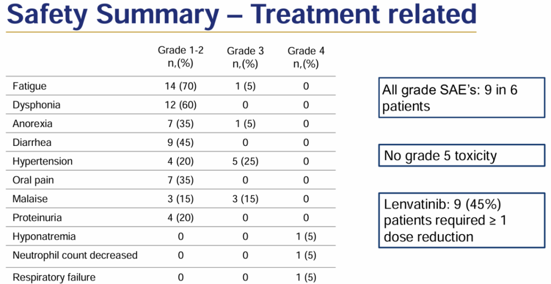 安全性方面,治疗相关不良事件(TRAE)普遍存在,但大多数为1~2级,尚可控制。最常见的TRAE为乏力(75%)、发声困难(60%)和腹泻(45%);共发生13例3~4级TRAE,在9例高血压不良事件中25%为3级,提示使用仑伐替尼期间患者的血压水平仍需积极管理。各有1例低钠血症、中性粒细胞计数下降和呼吸衰竭的4级TRAE发生,表明以上不良事件虽然罕见却严重,需要密切监测和及时干预。在6名患者中观察到9例次严重TRAE。45%的患者因毒性至少有1次未接受足够剂量的仑伐替尼治疗。值得关注的是,本研究中未发生5级事件,安全性可控。