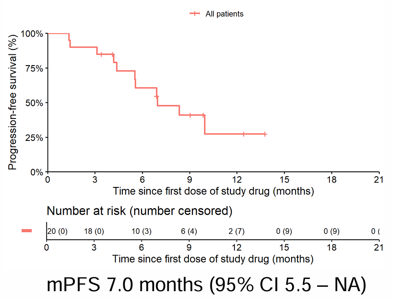 在研究中位随访时间21个月时,患者的中位PFS为7.0个月(95%Cl:5.5-NA),截至15个月时所有患者均达到次要研究终点。