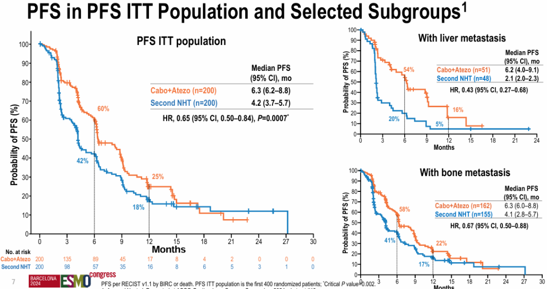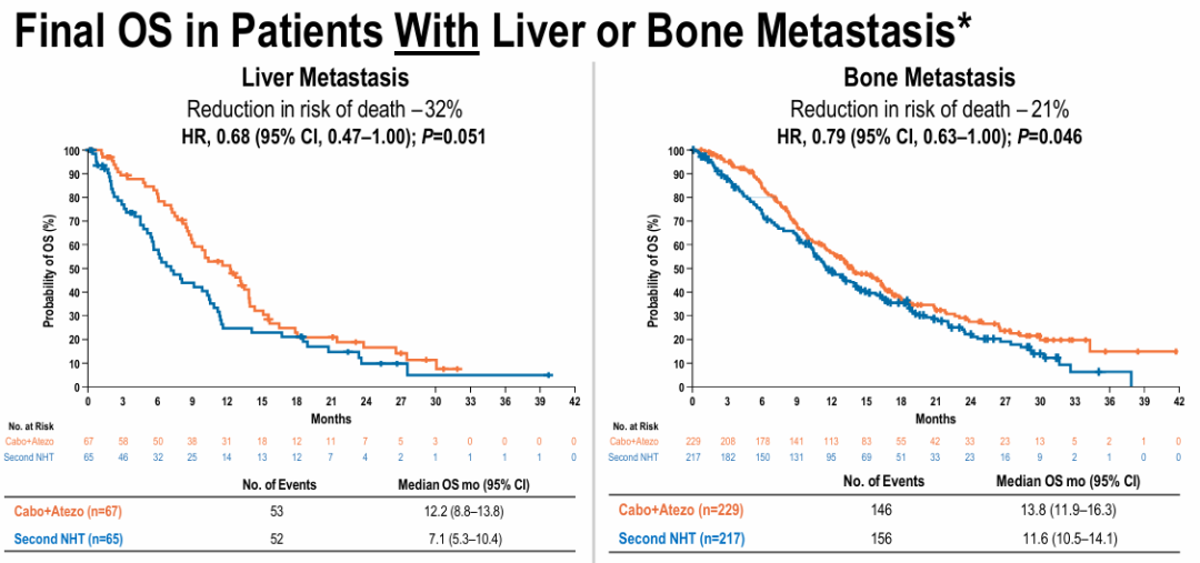 对于OS,卡博替尼联合阿替利珠单抗组的数值与NHT组接近(14.8个月vs.15.0个月)。而对于肝转移和骨转移亚组,相对于NHT治疗,卡博替尼联合阿替利珠单抗可分别降低患者死亡风险32%(HR 0.68,P=0.051)和21%(HR 0.79,P=0.046)。