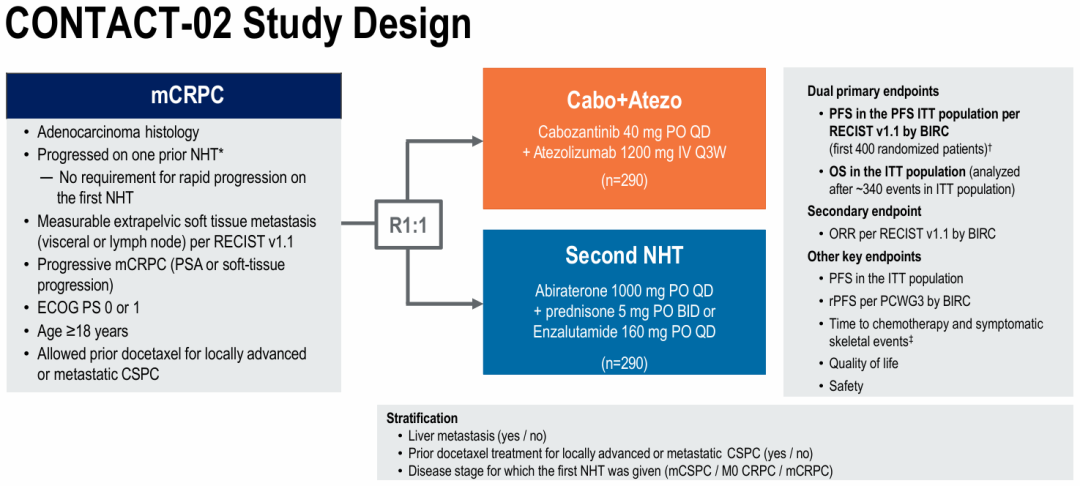 对于NHT治疗后病情进展且具有盆腔外淋巴结转移或内脏转移的mCRPC患者,按1:1随机分接受卡博替尼联合阿替利珠单抗治疗,或接受NHT(阿比特龙+泼尼松或恩扎卢胺)治疗。两个主要终点是BIRC评估的PFS(前400名患者;PFS ITT)和OS(所有随机患者;ITT)。