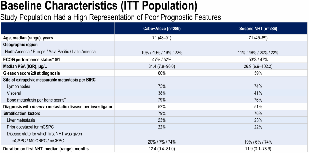 在数据截止时(中位随访期24.0个月),575名患者随机接受卡博替尼联合阿替利珠单抗治疗(n=289)或NHT治疗(n=286)。组间的基线特征平衡:79%/76%存在骨转移,23%/23%存在肝转移,22%/22%曾接受过多西他赛治疗。49%和56%的患者接受了后续全身治疗(36%和49%的患者接受了研究后的紫杉烷治疗)。