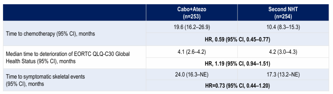 在其他方面,卡博替尼联合阿替利珠单抗也可改善患者的至化疗时间(19.6个月vs.10.4个月,HR 0.59)和至症状性骨相关事件时间(24.0个月和17.3个月,HR 0.73)。