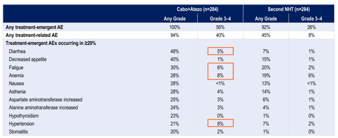 卡博替尼联合阿替利珠单抗组40%患者和NHT组8%患者发生了治疗相关3~4级不良反应。没有5级治疗相关不良反应。卡博替尼联合阿替利珠单抗组的17%和NHT组的15%患者因TEAE而停止所有治疗。
