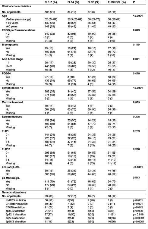 本研究旨在阐述FL1-2、FL3A、FL3B和FL/DLBCL患者的临床特征和遗传异质性。