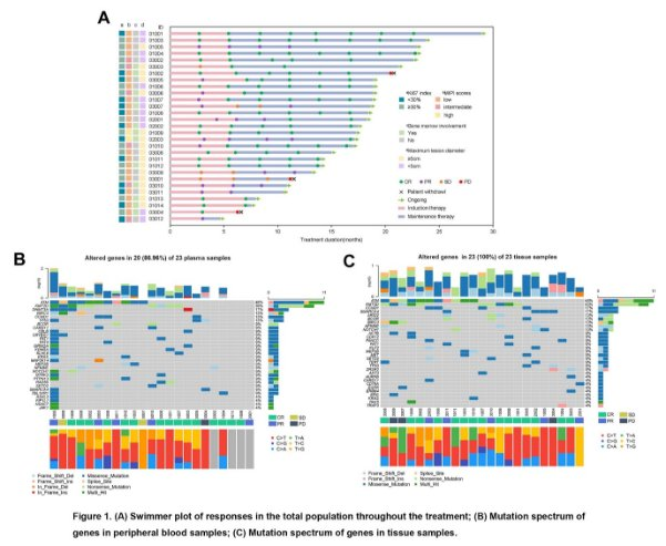 图1.(A)整个治疗过程中总人口的反应图:(B)外周血样本中基因的突变谱系:(C)组织样本中基因的突变谱系。