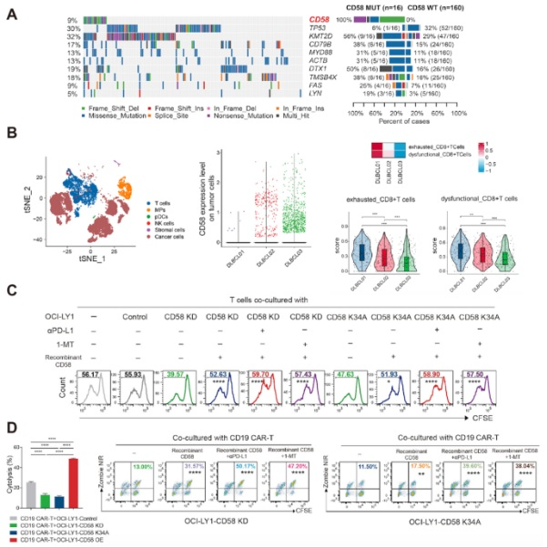 通过对新发DLBCL患者的靶向深度测序(n=176)、全外显子测序(n=38)和RNA测序(n=162)来全面分析CD58的遗传特性。为了研究CD58变异对共抑制分子表达和免疫细胞功能的机制影响,我们对肿瘤样本进行了大量和单细胞RNA测序分析,并分别进行了体外和体内实验。