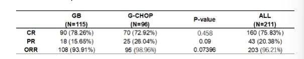 共有153例FL患者接受了GB方案治疗,148例患者接受了G-CHOP作为一线治疗。除了分级(P<0.001)之外,两组患者的基线特征没有显示其他统计学差异。在完成诱导治疗并进行评估的211例患者中,203例患者达到了反应(客观反应率,ORR,96.21%),160例患者达到了完全反应(完全反应率,CR%,75.83%)。两种治疗方案的疗效没有差异(如表1所示)。