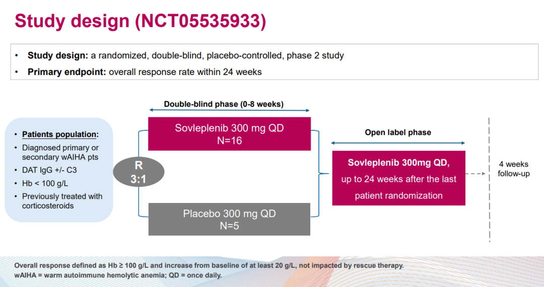 在本次EHA会议上,公布了索乐匹尼布治疗wAIHA患者的ESLIM-02 II/III期研究(NCT05535933)II期部分的疗效和安全性结果(摘要号:S297)8该研究是首个(截至发稿日)在中国wAIHA人群进行的随机双盲的SYK抑制剂研究。研究共纳入21例血红蛋白(Hb)水平<100 g/L、直接抗球蛋白试验(DAT)阳性(IgG+,伴或不伴C3+),且既往至少一线皮质类固醇治疗失败的wAIHA患者,其中原发性占90.5%,继发性占9.5%。此外,38.1%为利妥昔单抗经治的患者。所有入组患者按3:1的比例,随机分配至索乐匹尼布(n=16)或安慰剂(n=5)组,接受持续8周的双盲治疗,随后接受至少16周的开放标签治疗。Hb应答被定义为:在无紧急治疗干预情况下,至少1次Hb≥100 g/L,且较基线增加≥20 g/L。研究的主要终点是24周内的总体Hb应答。关键次要终点为持续Hb应答,即在至少间隔7天的连续3次可用评价中Hb≥100 g/L,并且较基线增加≥20 g/L,不受急救治疗的影响。