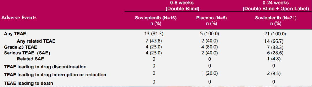 在ESLIM-02 II期研究中,没有患者因治疗期间出现的不良事件(TEAEs)而停药。与安慰剂相比,索乐匹尼布组在各级别TEAE的发生率均较低,且未观察到≥4级的不良事件。TEAE包括1/2级的γ-谷氨酰转移酶和肝酶升高等。这些数据或可表明,索乐匹尼布在wAIHA治疗中有望提供一种患者可耐受的治疗选择。