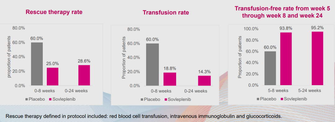 除上述结果外,索乐匹尼布在减少紧急治疗需求和改善患者疲劳症状方面也有一定的表现。在该研究中,紧急治疗被定义为包括红细胞输注、静脉注射免疫球蛋白和糖皮质激素在内的治疗措施。与安慰剂相比,在0至8周和0至24周的时间段内,索乐匹尼布组减少了紧急治疗的需求。在第5周至第24周期间,达95.2%的患者无需输血,减少了输血相关的风险。慢性病治疗功能评估-疲劳量表(FACIT-F)是一种用于评估患者疲劳程度的工具,其分数越高,表明疲劳程度越低,患者的生活质量越高。在8周和24周的评估中,与安慰剂组相比,索乐匹尼布组患者的FACIT-F评分比基线时提高。