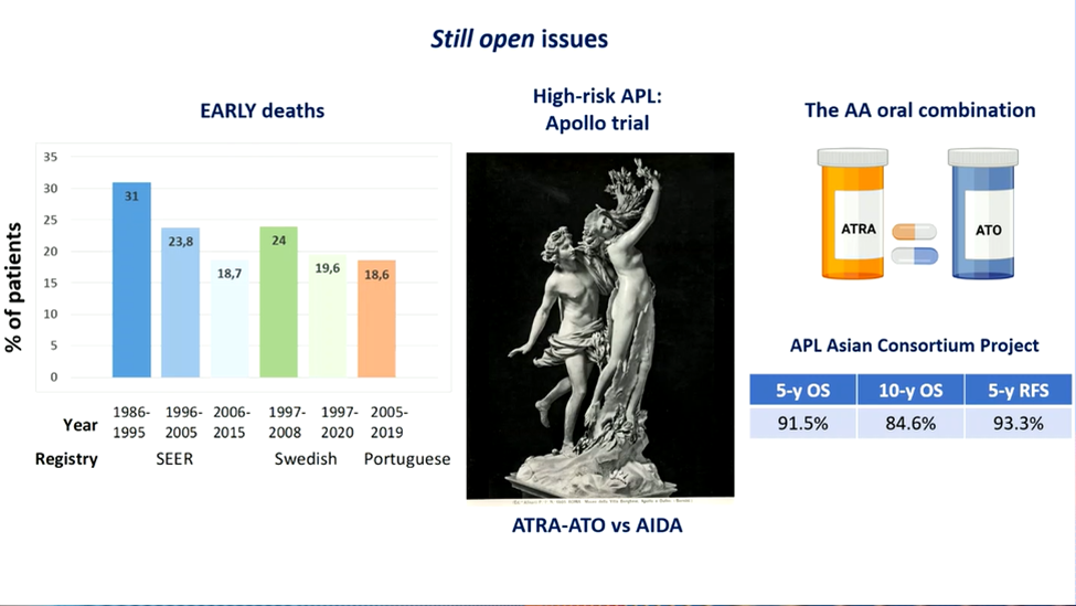 APL管理中的主要挑战之一是降低诊断后30天内的早期死亡率。美国国家癌症研究所监测、流行病学和结果(SEER)、瑞典和葡萄牙等多方数据库,展示了数年来在降低早期死亡率方面取得的进展。SEER数据库涵盖1986年至1995年期间,报告了高达31%的早期死亡率。随着时间的推移,这一比例逐渐下降,最新的葡萄牙数据库(2005-2019年)表明早期死亡率为18.6%。瑞典数据库在1997年至2008年期间报告的早期死亡率为24%,显示了早期管理策略的持续改进。尽管早期死亡率有所改善,但在最新队列中早期死亡率的持续存在表明,仍然需要对高危患者的早期诊断和支持治疗进行进一步的改进。