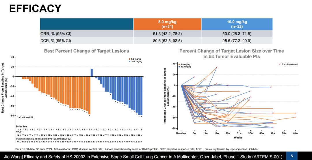 HS-20093后线治疗广泛期小细胞肺癌患者展示了良好的抗肿瘤活性,8 mg/kg具有更好的安全谱,没有观察到新的安全性信号且未观察到B7H3表达水平和疗效的关系。目前,III期临床研究正在进行中。