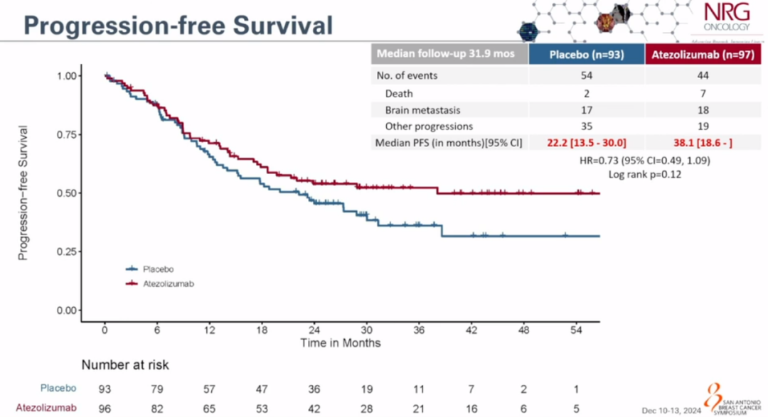 遗憾的是,NRG-BR004研究的结果并未如预期般乐观。该研究旨在比较在THP方案基础上联合阿替利珠单抗与安慰剂组之间的疗效差异,主要终点为PFS。尽管入组患者特征均衡,但研究因为阿替利珠组较多的死亡病例而于2022年5月提前结束入组。最终结果显示,阿替利珠单抗组的PFS并未显著优于安慰剂组。具体而言,阿替利珠单抗-THP组的2年PFS为54.0%,而安慰剂-THP组为45.6%,HR 0.73(95%CI:0.49~1.09)P=0.12。这一结果并未达到统计学显著性。