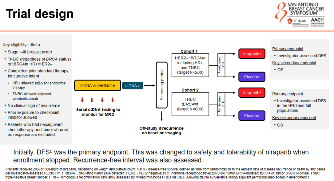 我首先要介绍的研究是——ZEST研究(摘要编号:GS3-01)。ZEST(NCT04915755)是首个针对乳腺癌开展的最小残留病灶(MRD)导向治疗的3期、随机、双盲临床试验,旨在评估已完成治疗且ctDNA阳性、无影像学复发的患者中,尼拉帕利(niraparib)的强化治疗是否能改善无病生存期(DFS)。遗憾的是,ZEST研究最终未能达到预期目标,研究提前终止。