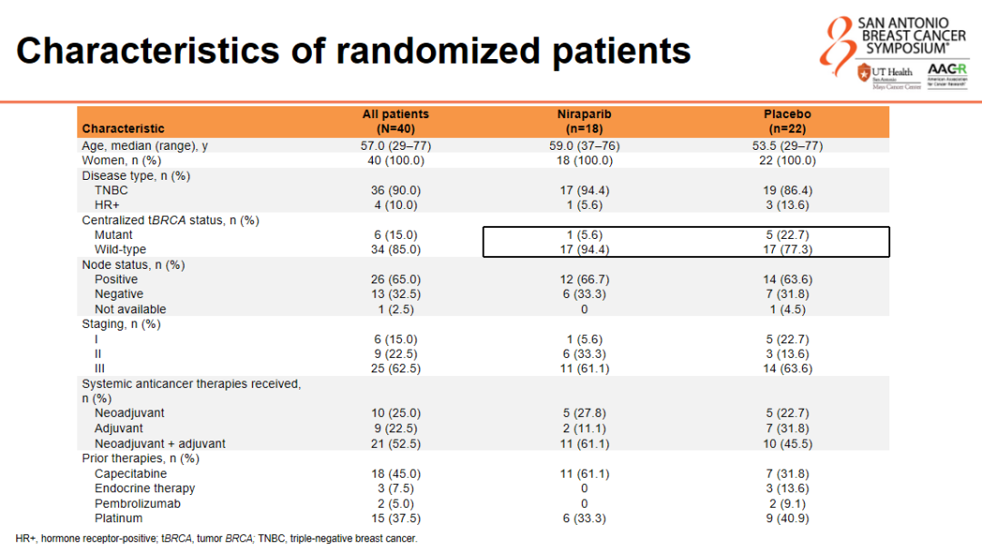40例患者入组并随机分配(尼拉帕利组18例;安慰剂组22例);36例患者(90%)为TNBC,4例患者(10%)为BRCA突变的HR+乳腺癌。在数据截止时,尼拉帕利组有6例患者、安慰剂组有4例患者仍在无影像学复发的情况下接受研究治疗。尼拉帕利组的中位DFS为11.4个月(95%CI:5.7~18.2),安慰剂组为5.4个月(95%CI:2.8~9.3)HR 0.64(95%CI:0.30~1.39)。