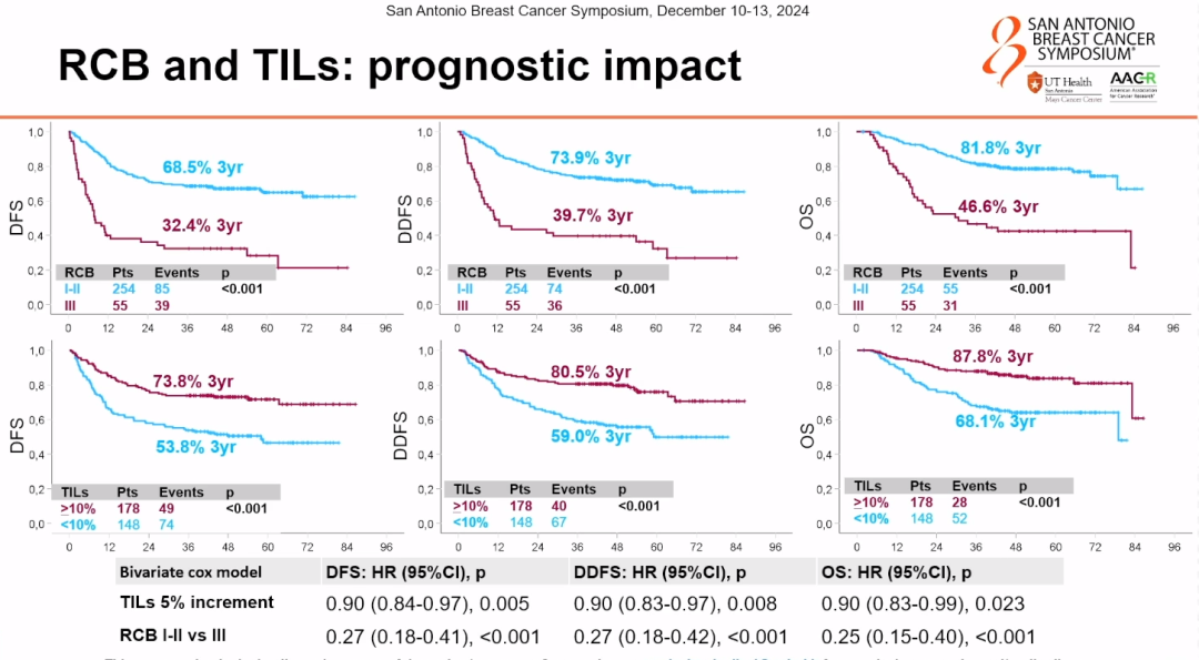 另一个重要的生物标志物是肿瘤浸润淋巴细胞(TILs)的比例。研究发现,在新辅助化疗后的标本中,如果TILs的比例小于10%,阿维鲁单抗的获益幅度会明显更大一些,但这类患者的预后相对更差。而如果TILs≥10%,患者的三年DFS较好,但此时阿维鲁单抗的获益并不明显。这表明,TILs比例也可以作为预测阿维鲁单抗疗效的一个重要因素。