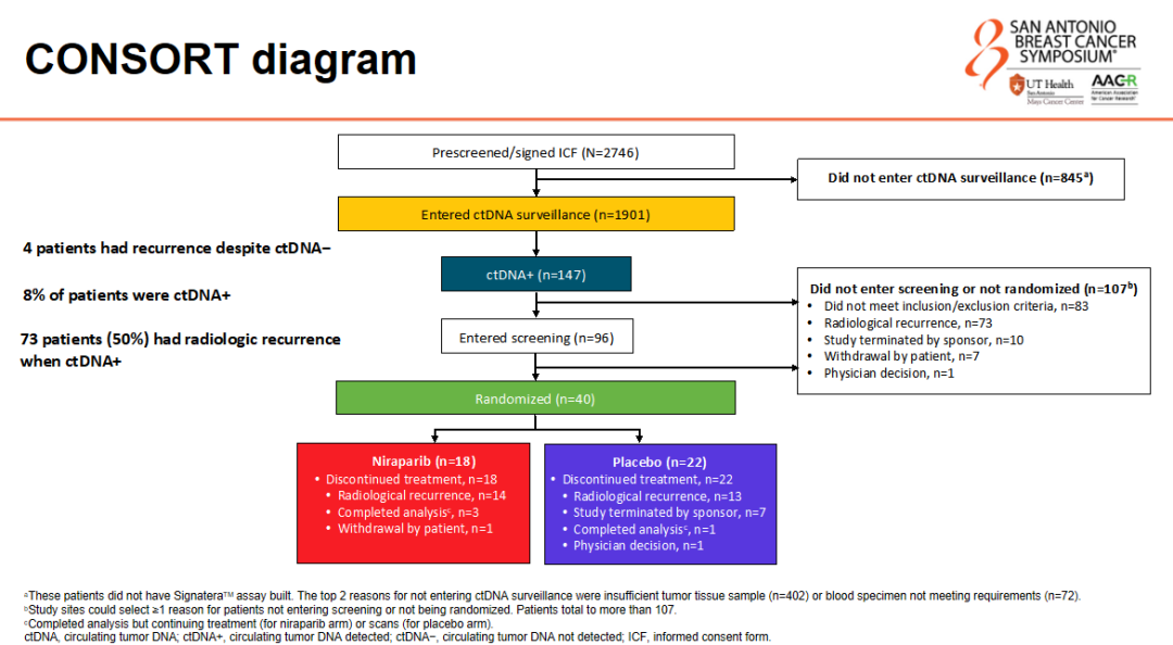 ZEST研究中符合入组条件的患者为I~III期三阴性乳腺癌(TNBC)或BRCA突变的HER2-乳腺癌患者。尽管研究总共筛选了多达2746例患者,并对其中1901例进行了ctDNA监测,但最终只有8%的患者(147例)呈现ctDNA阳性结果。更为不幸的是,在这147例ctDNA阳性的患者中,有73例(50%)患者在发现ctDNA阳性时已经出现了影像学转移,因此无法入组。研究在随机化阶段入组的患者数量极少,仅有40例。