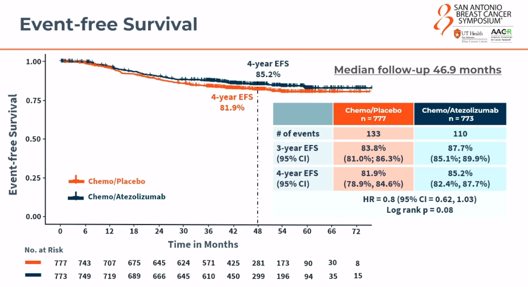 尽管研究入组了1550例患者,然后将患者按照1:1随机分配至阿替利珠单抗/安慰剂组,但最终结果却令人意外地呈现为阴性,两组4年的EFS数据分别为81.9%和85.2%,HR=0.8,(95%CI:0.62~1.03)Log rank P=0.08。