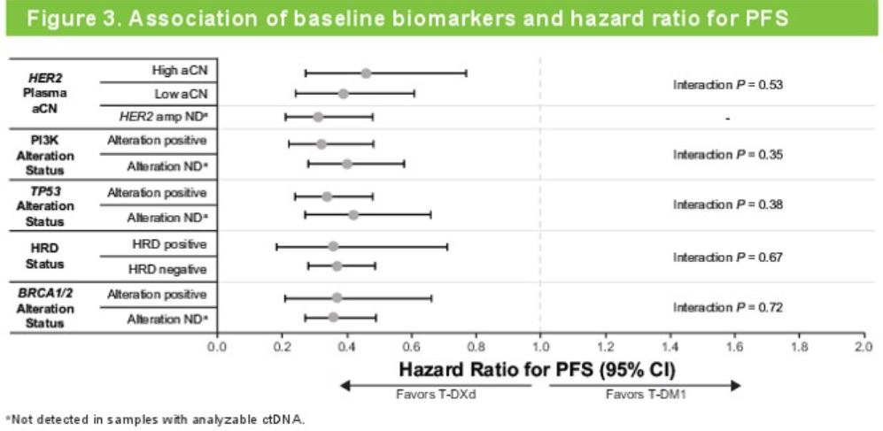 图3.基线不同生物标志物亚组中T-DXd vs T-DM1的PFS风险比