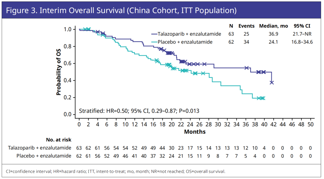 另一个值得关注的是,这次大会还报道了TALAPRO-2中国人群的数据,此前该研究已经报道在总人群(未经HRR选择NR vs.21.9个月;HR 0.69,P<0.001)、HRD突变患者(HR 0.46,P<0.001)、HRD未知/阴性患者(HR 0.70,P=0.004)中恩扎卢胺+他拉唑帕利治疗的rPFS获益[2]。这次报道的中国患者数据显示了一致甚至更好的获益,总人群(33.3 vs 10.9个月;HR 0.30;P<0.0001)、HRD突变患者(15.7 vs 4.0个月,HR 0.16;P=0.0044)、HRD未知/阴性患者(35.9 vs 13.8个月,HR 0.36;P=0.0018)的rPFS风险降低幅度均大于全球患者[3]。近期(2024年10月11日),企业方宣布该研究达到OS结果,总人群和HRD患者均有显著意义和临床意义的OS获益[4],而在此次ESMO报道的中国患者中也显示了积极OS结果,总人群的死亡风险显著降低50%(HR 0.50;P=0.013);这是全球首个也是唯一一个PARP抑制剂联合NHT一线治疗可显著改善mCRPC患者OS的药物组合,而PROpel研究目前尚未获OS阳性结果(HR 0.81)。