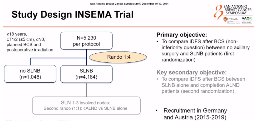 这项INSEMA研究与SOUND研究非常类似,都是在这些低危患者中进行观察,哪些患者在豁免前哨淋巴结活检后,与前哨淋巴结活检相比,具有相似的IDFS(无病生存期)甚至OS(总生存期),以及整体生活质量。然而,在临床设计上,INSEMA研究与SOUND研究有所不同。INSEMA研究采用了1:4的随机分组,即1位患者被随机分配到非SLNB组,就有4位患者被随机分配至SLNB组。这样的设计可能会让人疑惑,因为它会大大增加样本量,并可能导致一些潜在的阳性数据结果无法达到。
