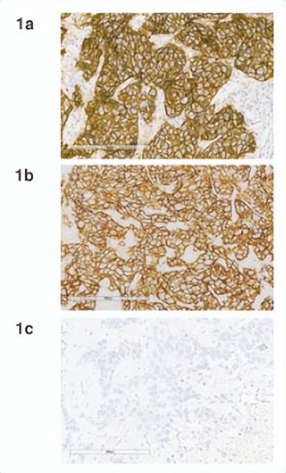 图1.一名转移性乳腺癌(MBC)患者HER2缺失的示例:原发肿瘤(1a)和转移灶(1b)的HER2免疫组化(IHC)表达均为3+,经T-DXd治疗后变为HER2 IHC 0(1c)。
